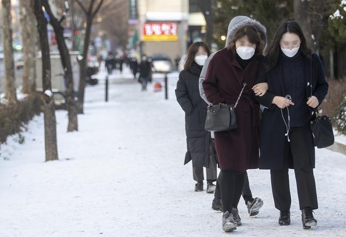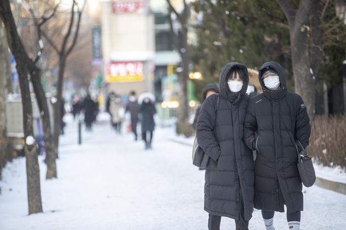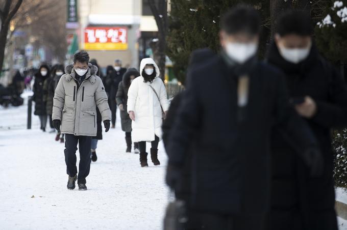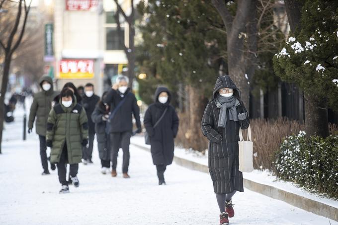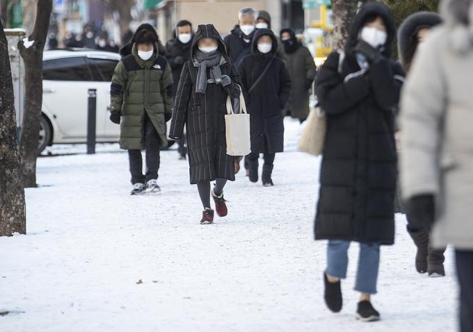 전국에 불어닥친 북극발 한파로 폭설을 동반한 강력한 추위가 이어지고 있는 7일 오전 서울 마포구 공덕역 인근에서 두꺼운 옷차림을 한 시민들이 몸을 웅크린 채 발걸음을 옮기고 있다.
