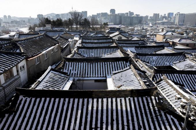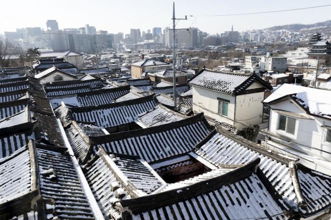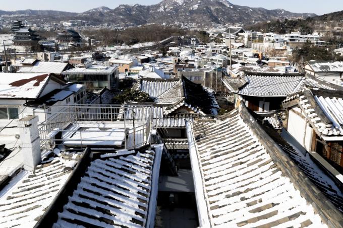 북극발 한파 영향으로 강추위가 이어지고 있는 7일 서울 종로구 북촌한옥마을 기와에 지난 밤 사이 내린 눈이 쌓여 있다.