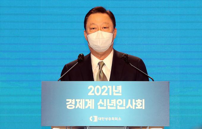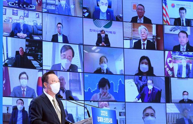 박용만 대한상공회의소 회장이 7일 서울 중구 대한상의에서 열린 2021년 경제계 신년인사회에서 인사말을 하고 있다.