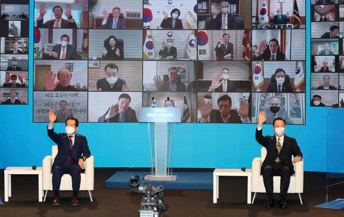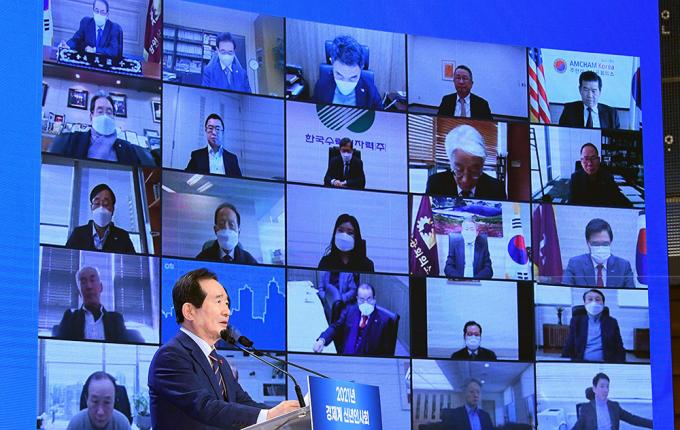 정세균 국무총리와 박용만 대한상의 회장이 7일 오후 서울 중구 대한상의 국제회의장에서 열린 2021년 경제계 신년인사회에 참석해 화상으로 참석자들과 인사를 나누고 있다.