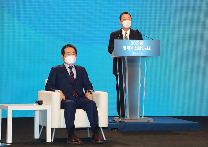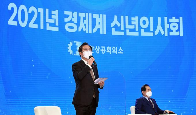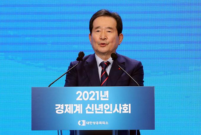 정세균 국무총리가 7일 서울 중구 대한상공회의소에서 열린 2021년 경제계 신년인사회에서 인사말을 하고 있다.