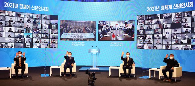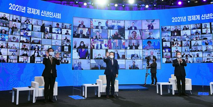 7일 서울 중구 대한상공회의소에서 열린 2021년 경제계 신년인사회에서 정세균 국무총리와 온·오프라인 참석자들이 손을 흔들며 인사하고 있다. 왼쪽부터 성윤모 산업통상자원부 장관, 정 총리, 박용만 대한상의 회장.