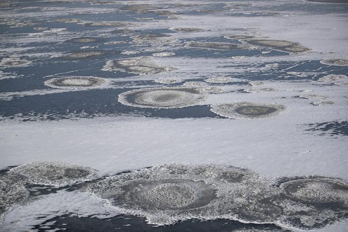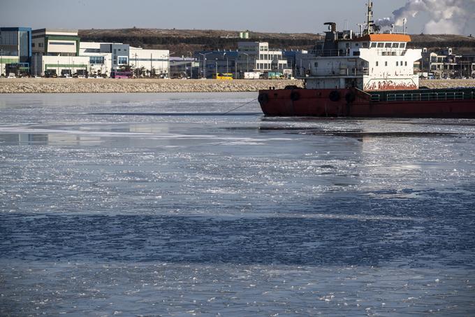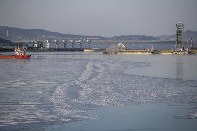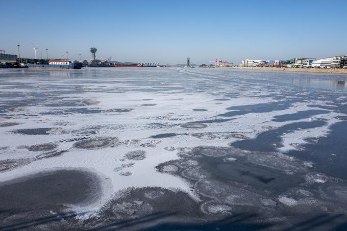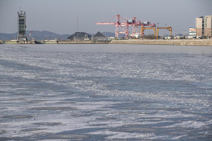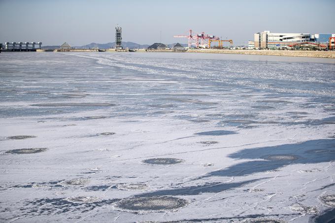 전국적으로 영하 20도를 넘는 북극발 한파가 절정에 달한 8일 오전 인천 서구 경인아라뱃길이 꽁꽁 얼어있다.