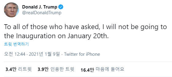 트럼프 대통령은 8일 오전 10시44분(한국시간 9일 오전 12시44분) 본인 트위터를 통해 "물어보는 모든 사람에게 알린다. 나는 1월 20일 취임식에 가지 않을 것"이라고 밝혔다. 트럼프 대통령이 바이든 당선인 취임식 참석 여부를 직접 언급한 것은 이번이 처음이다.