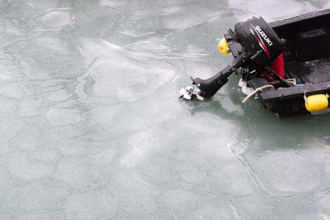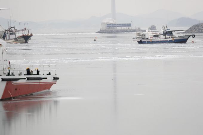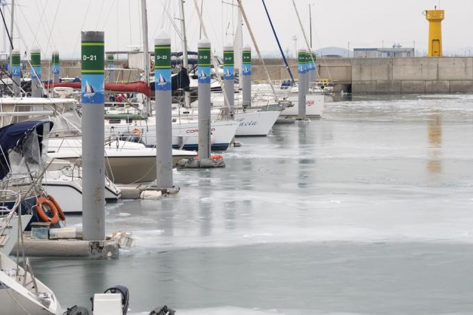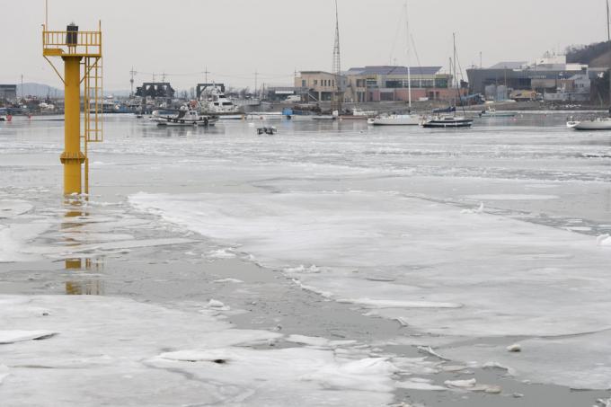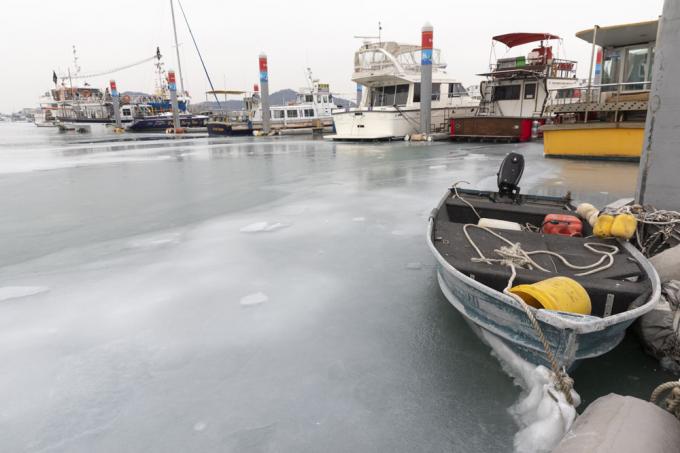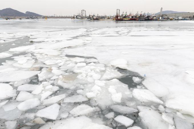 북극발 한파가 이어지고 있는 11일 오후 경기 화성 전곡항 주변 바다가 얼어 있다.