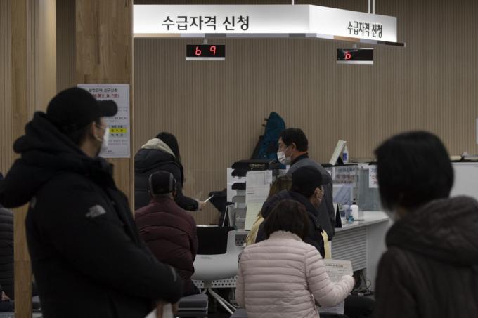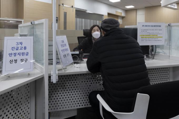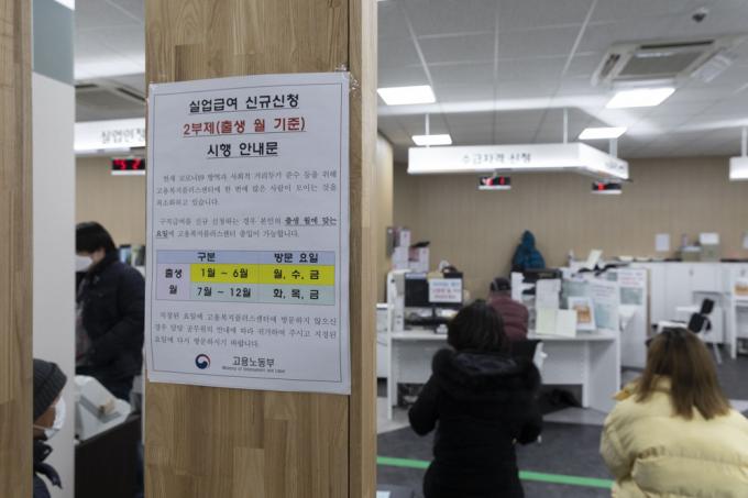 사회적 거리두기 2.5단계가 시행되고 있는 12일 오후 서울 영등포구 고용노동부 남부고용센터가 실업급여 수급자격 신청 등을 위한 시민들로 붐비고 있다. 지난 11일 고용노동부는 노동시장 동향 발표를 통해 2020년 12월 구직급여 지급액이 9566억으로 집계됐다고 밝혔다.