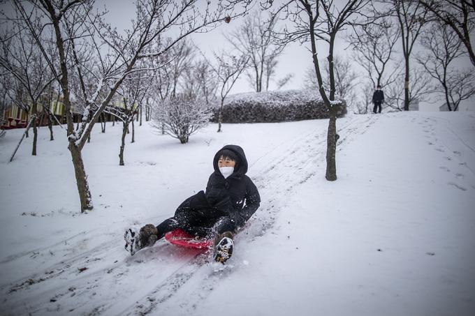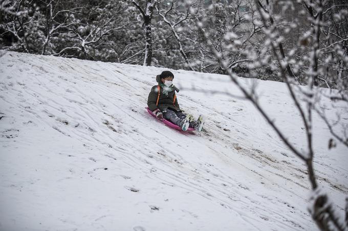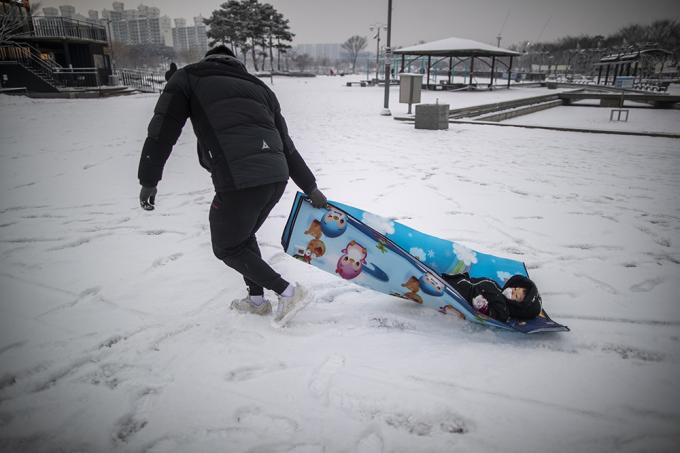 폭설이 내린 12일 오후 경기 부천시 상동호수공원에서 어린이가 썰매를 타고 있다.