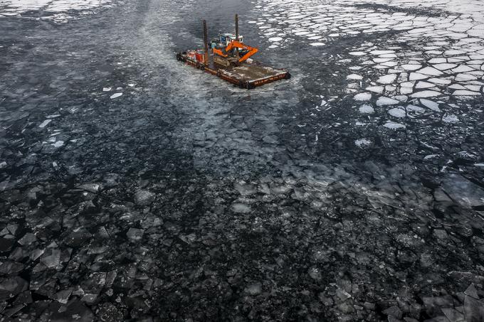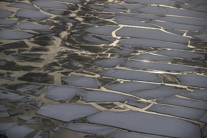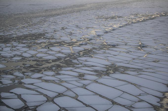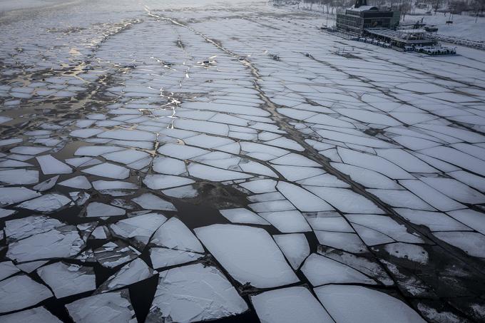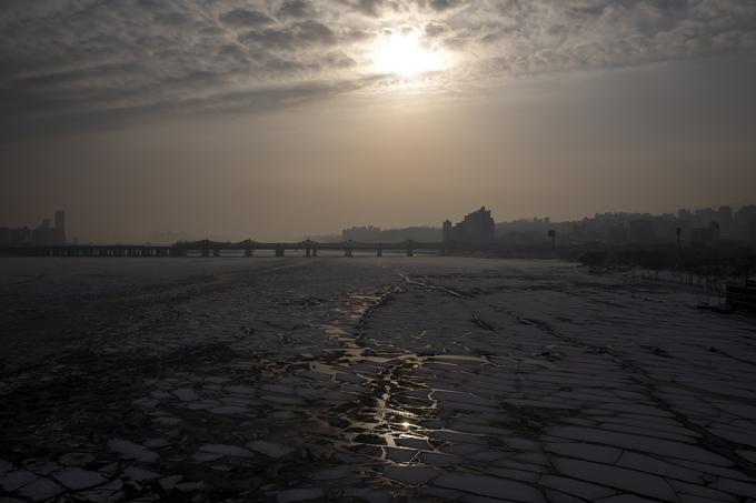 13일 오전 서울 영등포구 원효대교에서 바라본 결빙된 한강 위에 전날 내린 눈이 쌓여 있다.