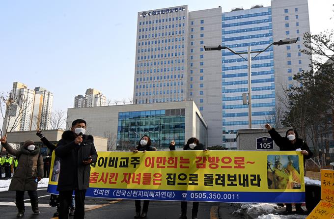 신천지 이만희 총회장이 감염병예방법 위반 등의 혐의 1심 무죄, 횡령·업무방해 유죄 선거를 받은 13일 수원지방법원 앞에서 신천지 피해자연대가 판결에 대한 기자회견을 갖고 있다.