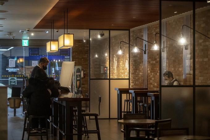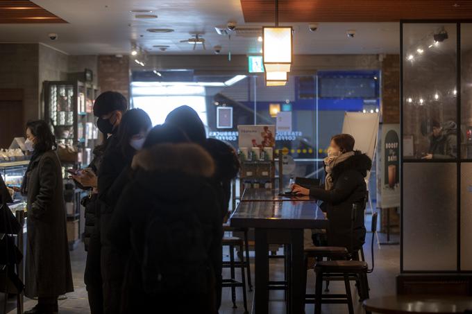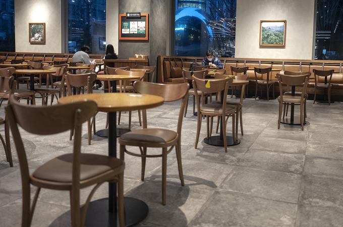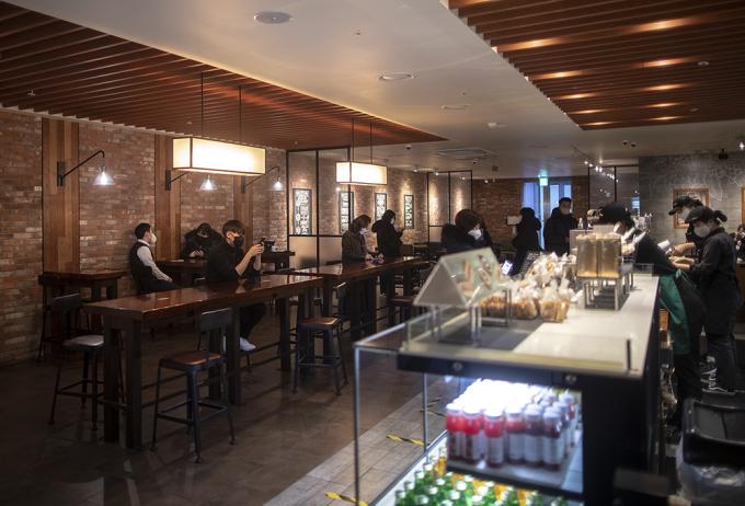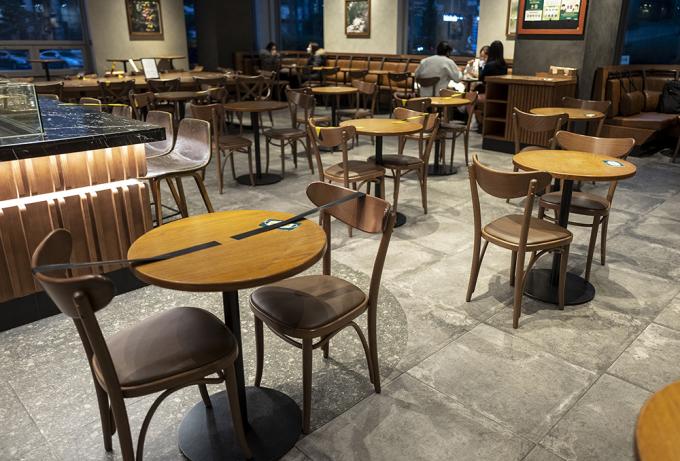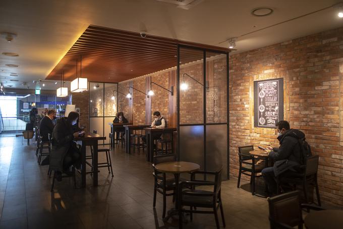 정부의 코로나19 사회적 거리두기 조정안을 통해 전국 카페에서 매장 내 취식이 가능해진 18일 오전 서울 시내의 한 프랜차이즈 커피전문점을 찾은 시민들이 자리에 앉아 커피를 마시고 있다. 정부는 지난 16일 발표를 통해 코로나19 확산 방지를 위한 사회적 거리두기를 일부 완화했다. 18일부터 카페도 식당과 같이 오후 9시까지 매장 내 취식이 가능하며, 헬스장 등 실내체육시설과 노래연습장 등 다중이용시설은 이용 인원을 시설 면적 8㎡당 1명으로 제한, 운영된다. 5인 이상 모임금지 조치는 오는 31일까지 2주간 연장한다.