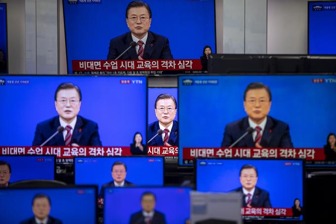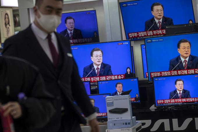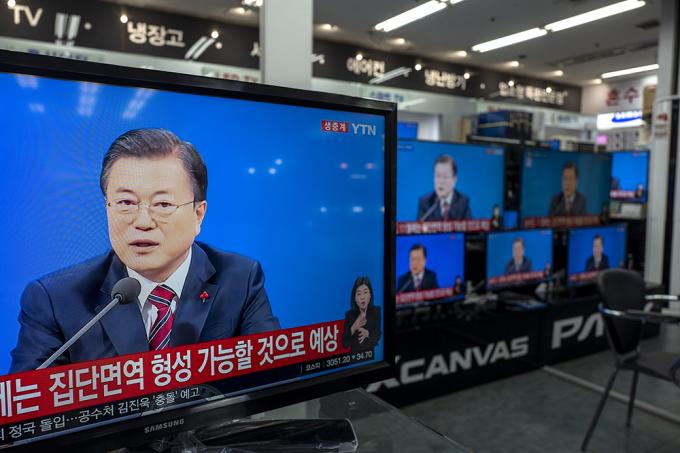 18일 오전 서울 용산구 용산전자상가에서 문재인 대통령의 신년 기자회견 생방송이 중계되고 있다.