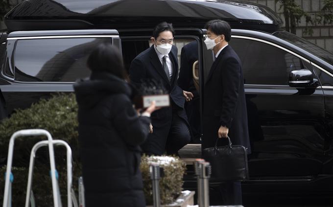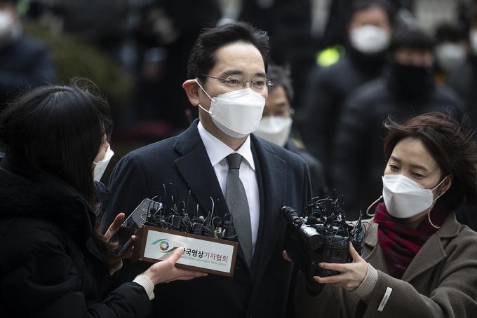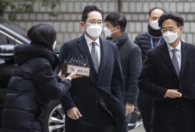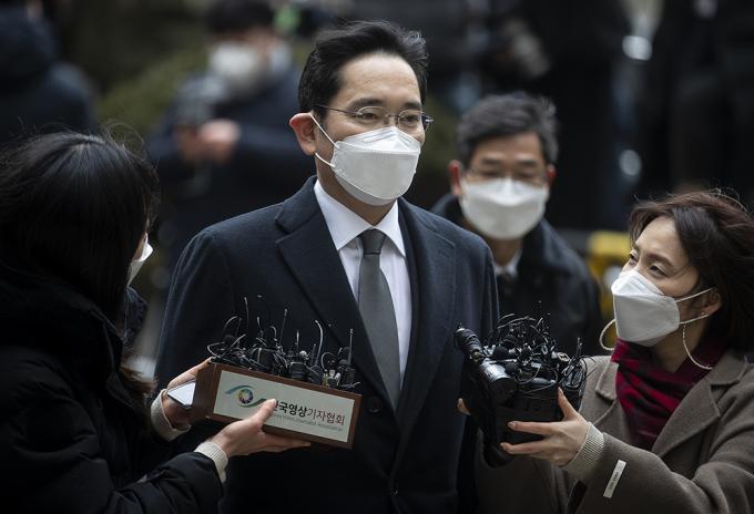 이재용 삼성전자 부회장이 18일 오후 서울 서초구 서울고등법원에서 열린 국정농단 사건 파기환송심 선고 공판에 출석하고 있다.