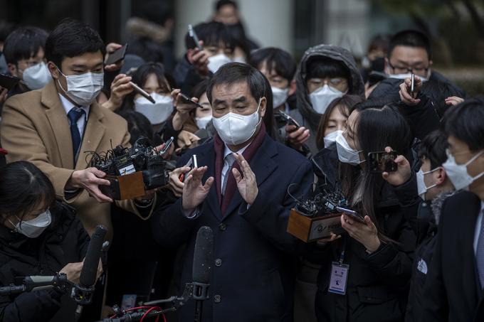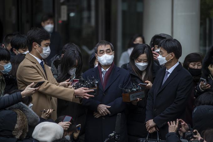 이재용 삼성전자 부회장 변호인단이 18일 오후 서울 서초구 서울고등법원에서 열린 국정농단 사건 파기환송심 선고 공판을 마친 뒤 법정에서 나와 취재진의 질문에 답하고 있다. 이날 법원은 이 부회장에게 징역 2년 6개월의 실형을 선고하고 법정구속했다.