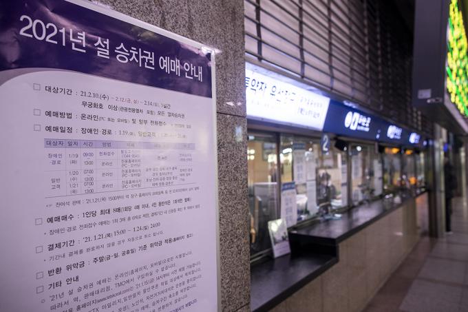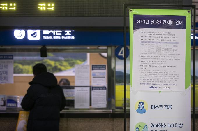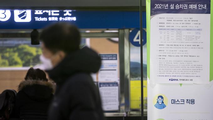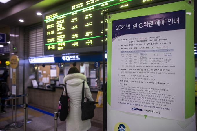 19일 오전 경기 수원역에 2021년 설 승차권 예매 안내문이 붙어 있다. 2021년 설 승차권은 코로나19 확산 방지를 위해 작년 추석 때와 같은 방식으로 온라인과 전화접수 등 100% 비대면 방식으로 사전 판매되며, 승객 간 거리두기를 위해 창측 좌석만 발매하고, 19일엔 경로·장애인을 시작으로 20~21일은 모든 국민이 KTX 19일~21일 SRT 26일~28일까지 예매할 수 있다.