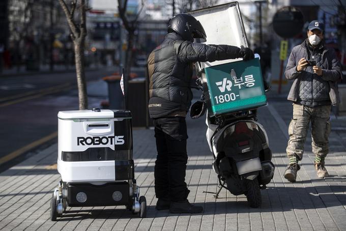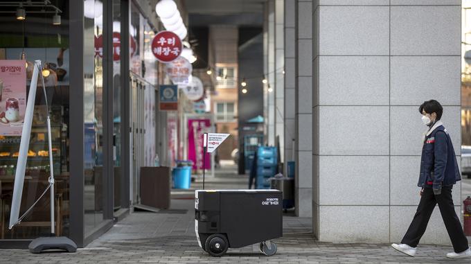 주문을 받은 '일개미'는 회사 앞 대기장소를 출발해 음식점으로 향했다. 자율주행을 원칙으로 움직이고 있지만 현재 도로교통법과 녹지공원법 상으로 배달로봇을 인도에서 운행하는 것이 제한돼 보조 인력이 옆에 항상 따라 움직인다.