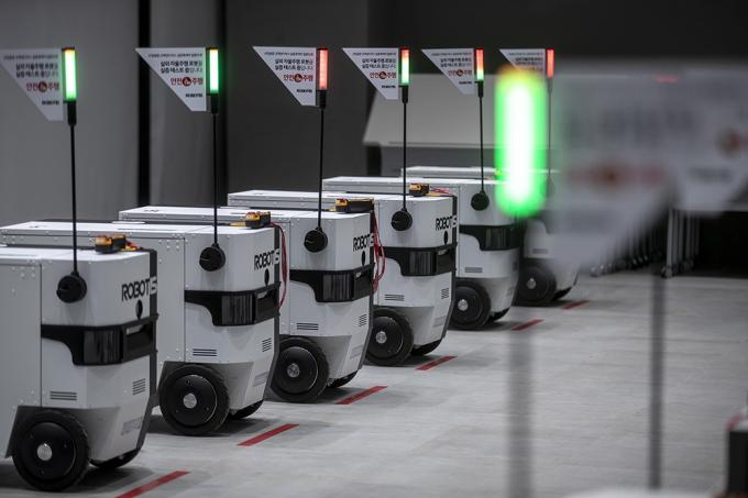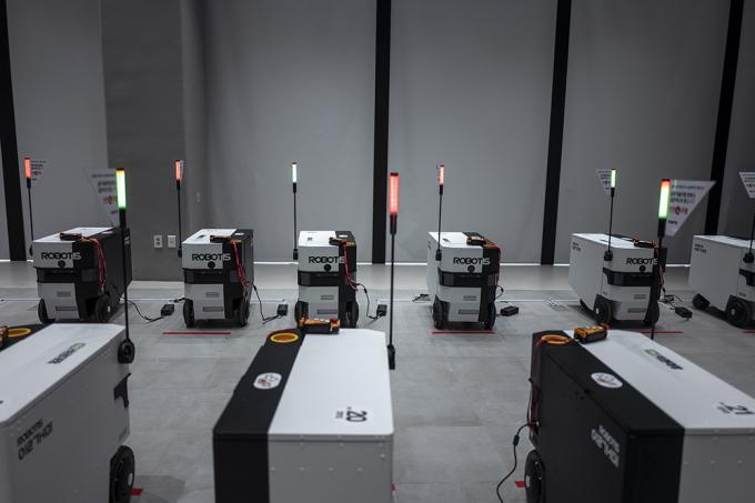 점심시간을 한 시간여 앞 둔 낮 11시 서울 강서구 마곡동 로보티즈 본사 앞에 '일개미' 라고 적힌 로봇이 줄지어 서 있었다. 이 로봇들의 정체는 로보티즈에서 자체 개발한 실외 자율주행 배달 로봇 '일개미'.
