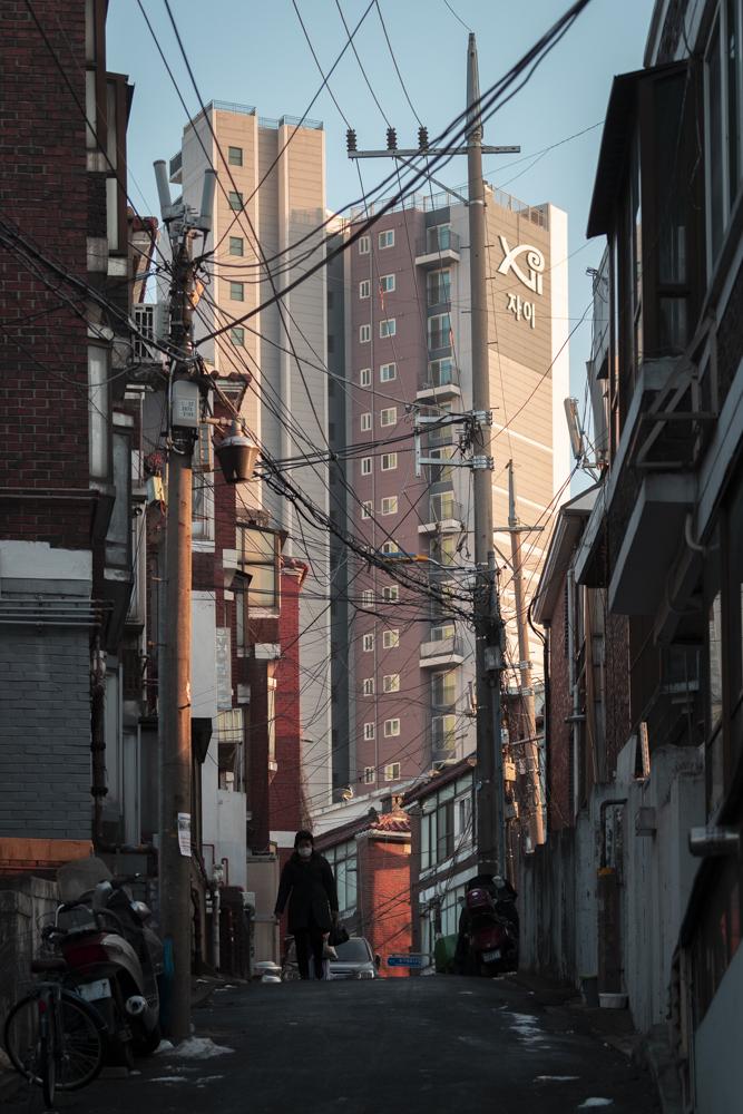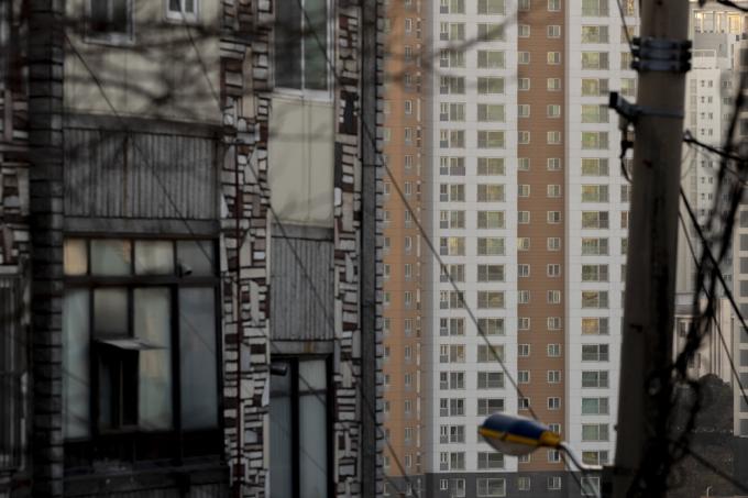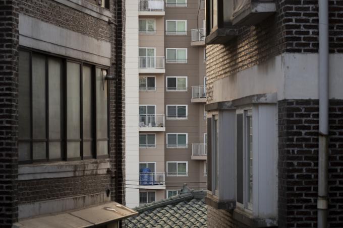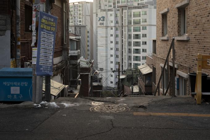 20일 오후 서울 마포구 아현동 주택가 일대 풍경. 낡은 주택가 사이로 우뚝 선 아파트가 딴세상처럼 느껴진다.