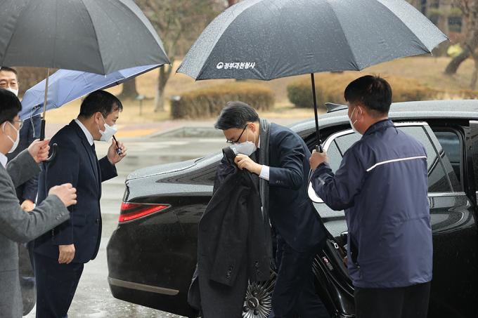 김진욱 초대 고위공직자범죄수사처장이 21일 오후 정부과천청사에 마련된 고위공직자범죄수사처(공수처) 사무실로 출근하고 있다.