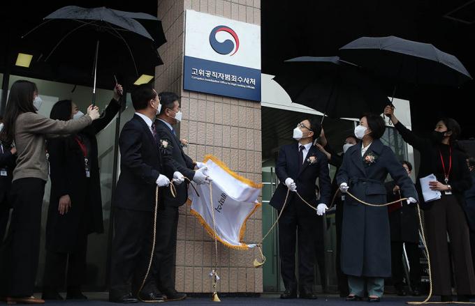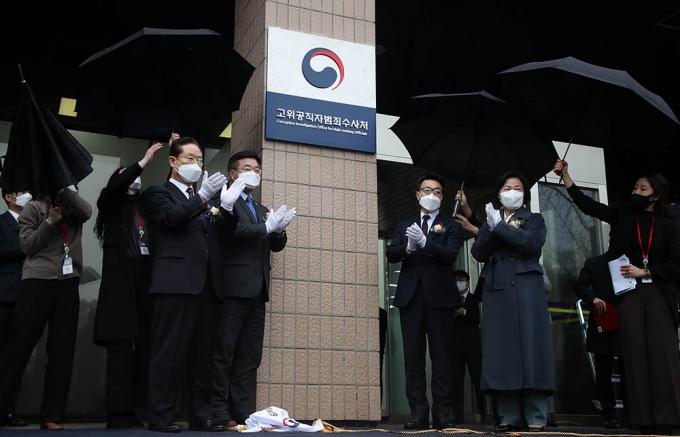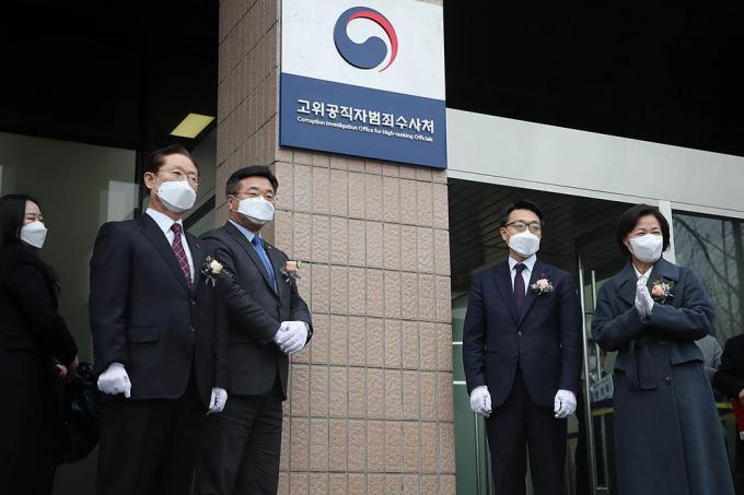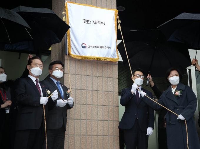 21일 오후 정부과천청사에서 열린 고위공직자범죄수사처 현판식. 왼쪽부터 두번째부터 윤호중 국회 법사위원장, 김진욱 초대 처장, 추미애 법무부 장관.