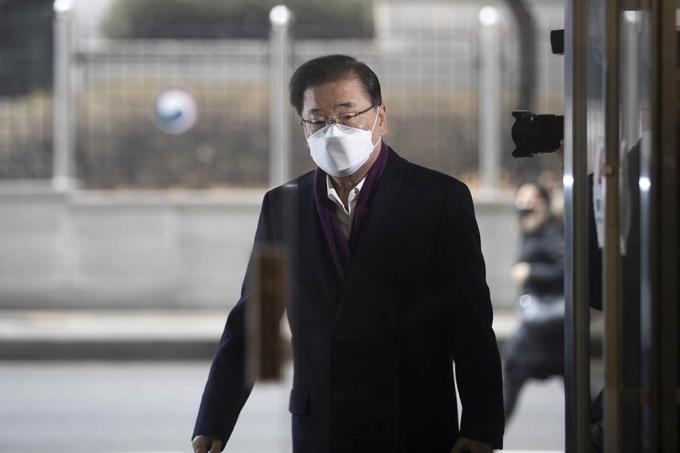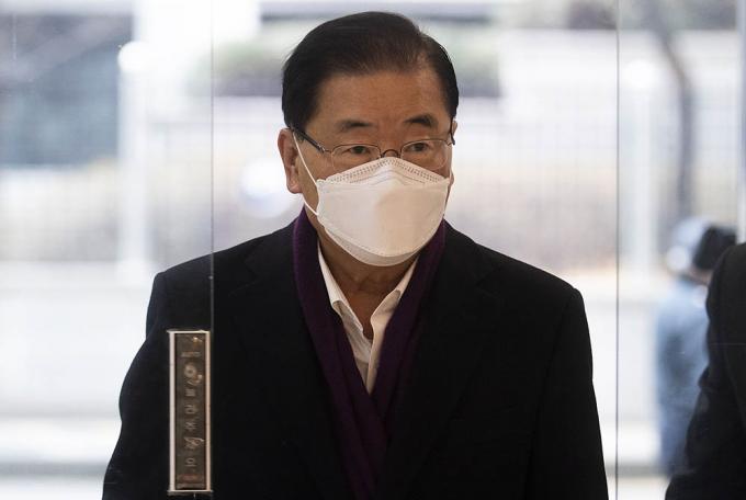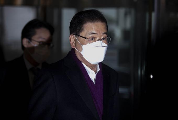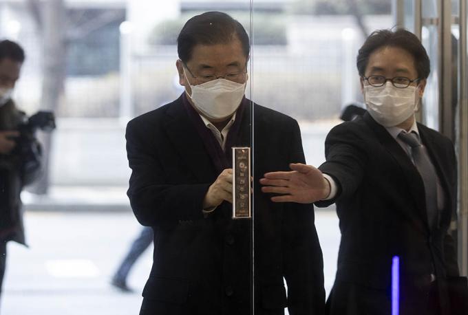 정의용 외교부 장관 후보자가 22일 오전 서울 종로구 도렴빌딩에 마련된 인사청문회 준비사무실로 출근하고 있다.