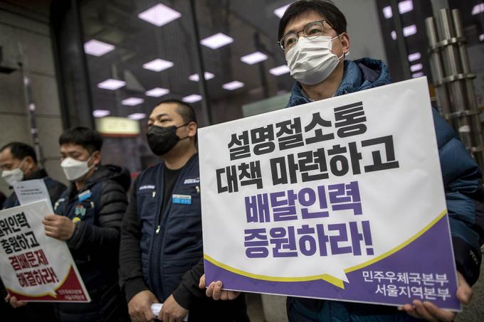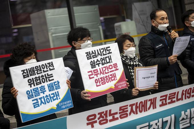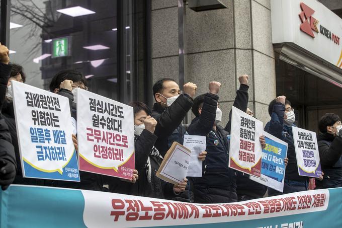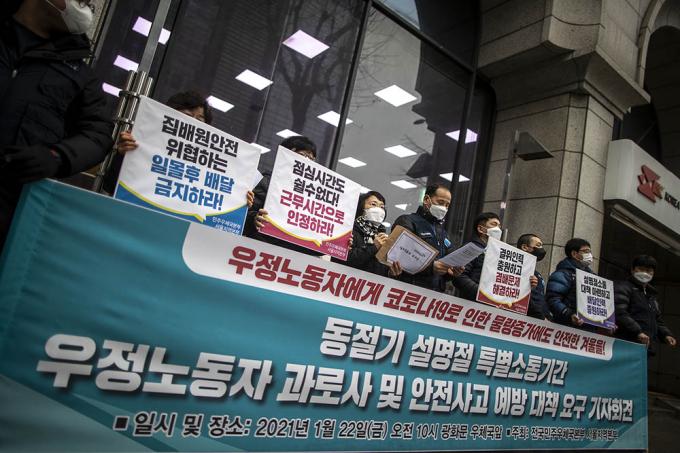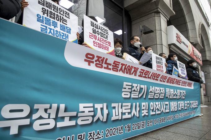 전국공공운수노조 민주우체국본부 관계자들이 22일 오전 서울 종로구 광화문우체국 앞에서 동절기·설명절 특별소통기간에 우정노동자들의 과로사와 안전사고 예방을 위한 대책을 요구하는 기자회견을 갖고 피켓 시위를 벌이고 있다.