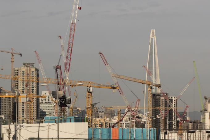 하늘로 치솟으며 분주하게 움직이는 저 타워크레인들은 무엇을 붙잡으려 하는 것일까. 아파트로 상징되는 도시의 욕망들이 끝도 없이 살아 꿈틀대고 있는 것은 아닐까. 어지럽게 움직이는 타워크레인의 손짓이 묘한 도시의 기운을 발산한다. 지난 25일 오후 서울 강남구 개포동 재건축 현장 일대.