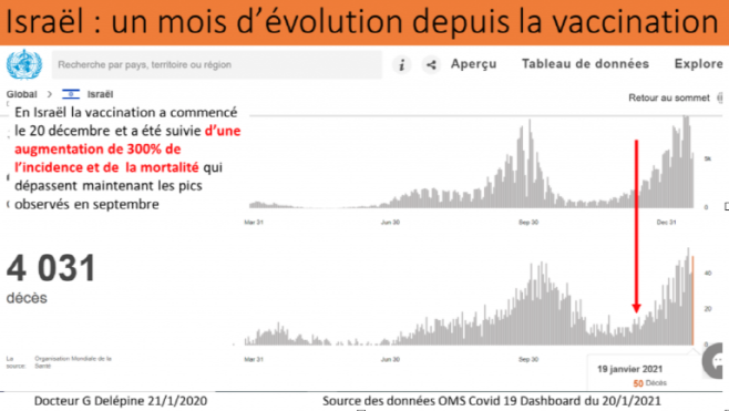 보고서는 이어 '이스라엘의 강력한 경고 신호'라는 제목의 글에서 "이스라엘은 지난해 12월 20일 이후 한달 동안 인구의 거의 25%(200만 명 이상)가 예방 접종을 받았다. 그러나 접종 이후 세계보건기구(WHO) 수치에 따르면 코로나19 일일 감염자와 사망 건수가 폭발적으로 증가했다"고 전했다. 이스라엘의 확진자 수는 12월 21일 1886 건에서 1월 20일 5674 건으로 3배 증가했다.