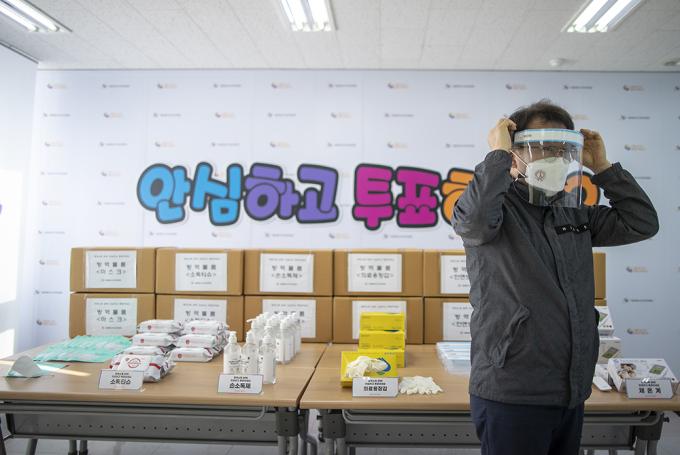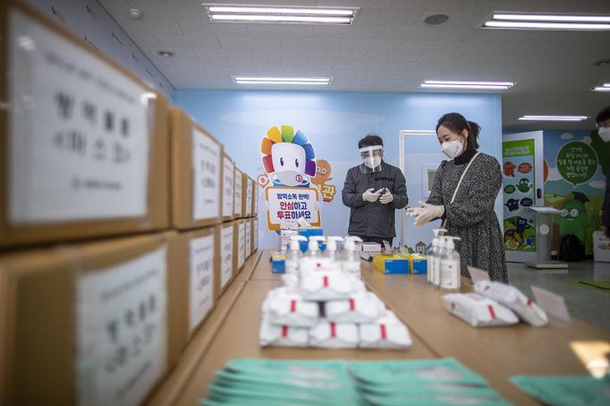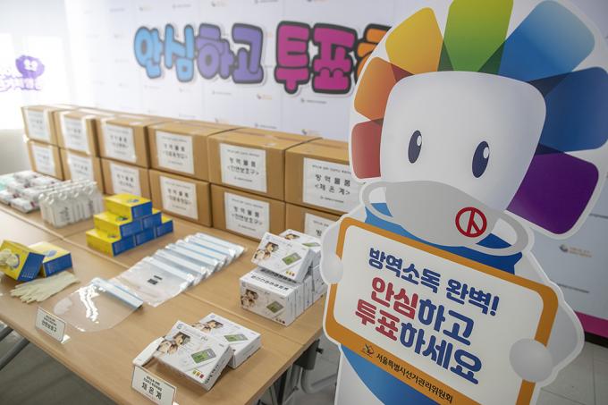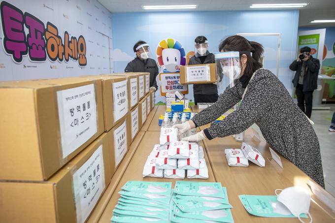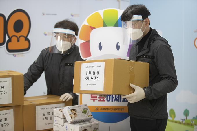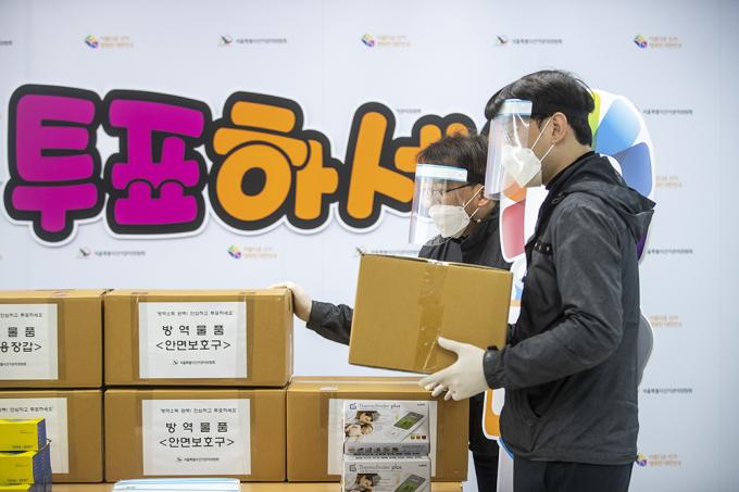 서울특별시선거관리위원회 관계자들이 28일 서울 종로구 서울특별시선거관리위원회에서2021년 서울시장 재·보궐선거에 활용될 방역물품을 공개하고 있다. 이번 재·보궐선거에 방역물품은 구선관위 각종 교육 및 개표소에서 활용 예정으로, 마스크, 손소독제, 소독티슈, 천연 라텍스 의료용 장갑, 안면보호구 등으로 구성되어 조기에 수급·배부할 예정이다.