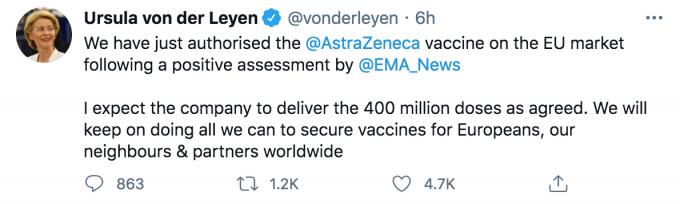 우르줄라 폰데어라이엔 EU 집행위원장은 이날 트위터를 통해 "유럽의약품청(EMA)의 긍정적인 평가에 따라 EU 시장에서 아스트라제네카 백신을 승인했다"고 밝혔다.