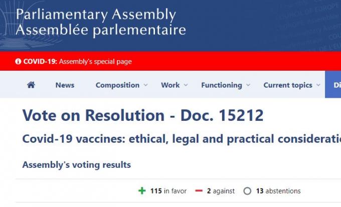 유럽연합(EU)의 입법부에 해당하는 유럽의회는 지난 27일 '코로나19백신의 윤리적·법적· 실제적 고려'라는 제목의 결의안 2361을 찬성 115, 반대 2, 기권 13의 압도적인 표차로 통과시켰다. 이같은 내용은 유럽의회 공식 웹사이트에 공시됐다.