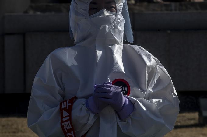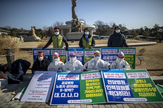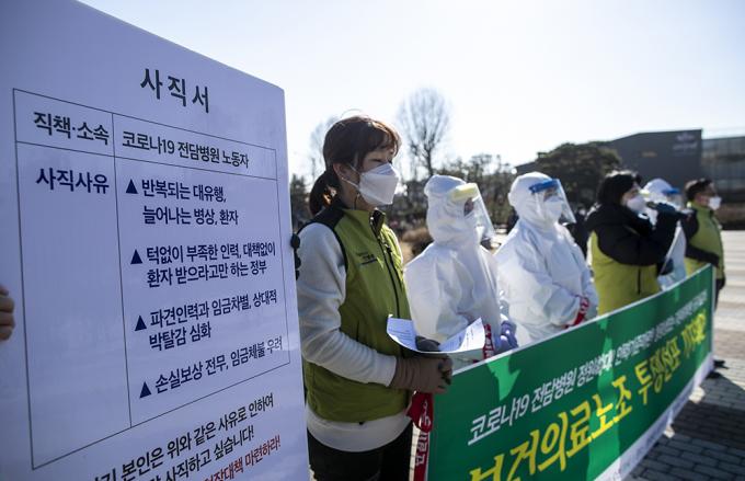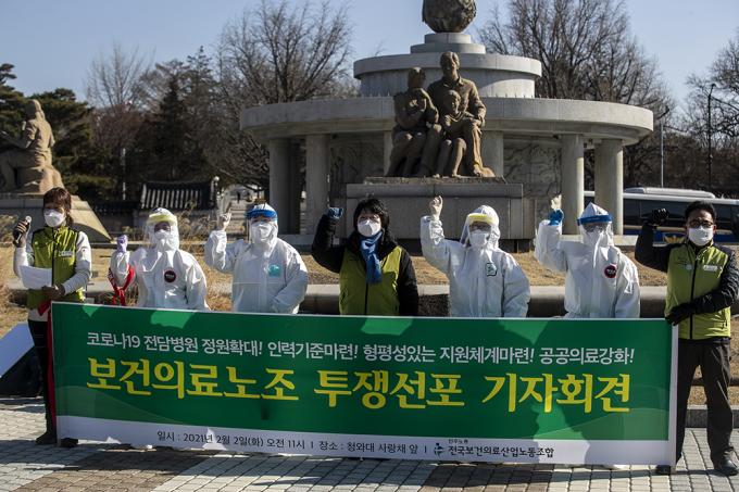 보건의료노조 조합원들이 2일 오전 서울 종로구 청와대 사랑채 앞 분수대에서 코로나19 전담병원 정원 확대, 인력기준 마련, 형평성있는 지원체계마련 등을 촉구하며 기자회견을 하고 있다.