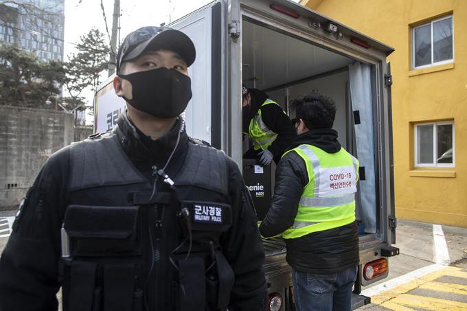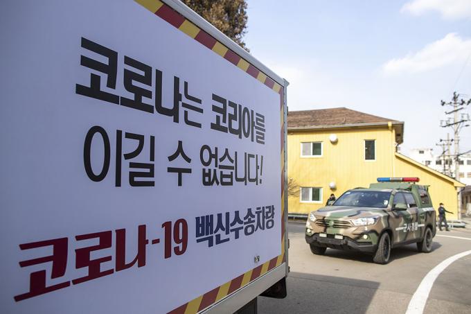 코로나19 백신 안전유통을 위한 부처합동 모의훈련이 실시된 3일 오후 서울 중구 국립중앙의료원 중앙예방접종센터에 백신 수송 훈련 차량이 들어서고 있다.