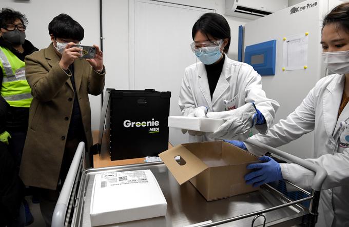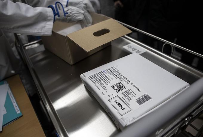 코로나19 백신 안전유통을 위한 부처합동 모의훈련이 실시된 3일 오후 백신 수송 훈련 차량이 서울 중구 국립중앙의료원 중앙예방접종센터에 도착, 관계자들이 아이스박스에서 백신 샘플을 꺼내 냉동고로 옮기고 있다.