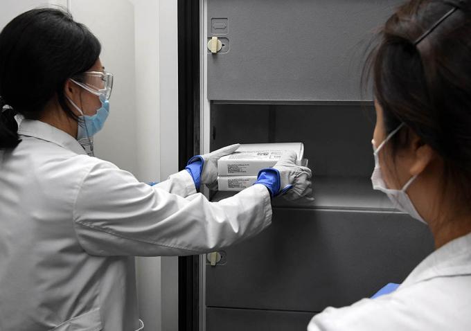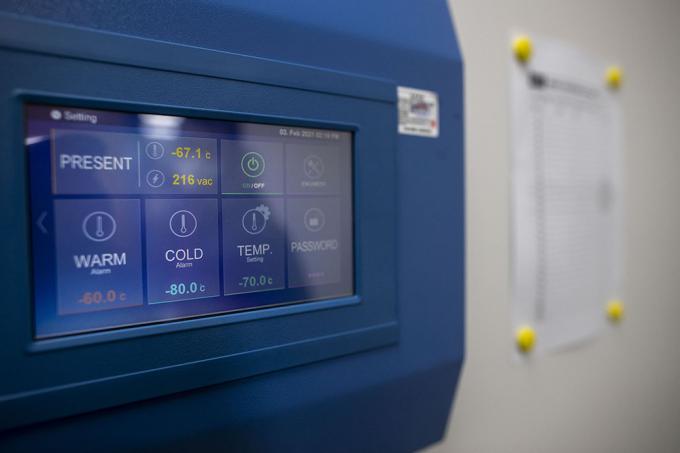 코로나19 백신 안전유통을 위한 부처합동 모의훈련이 실시된 3일 오후 서울 중구 국립중앙의료원 중앙예방접종센터에서 훈련용 백신모형이 담긴 초저온 냉동고가 가동되고 있다.
