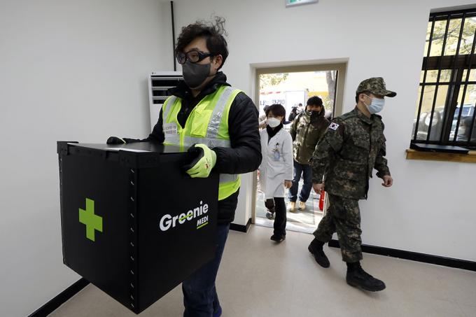 코로나19 백신 안전유통을 위한 부처합동 모의훈련이 실시된 3일 오후 서울 중구 국립중앙의료원 중앙예방접종센터에서 관계자들이 훈련용 백신모형을 옮기고 있다.