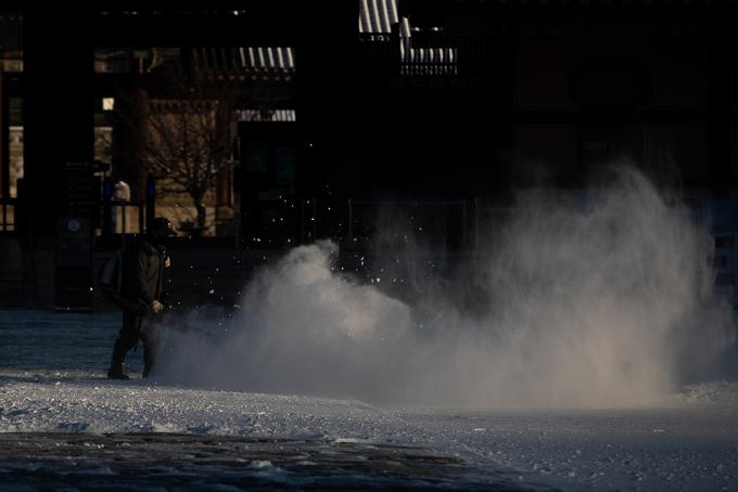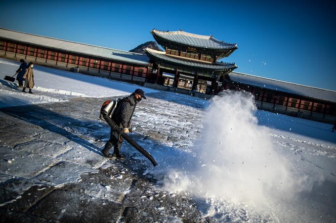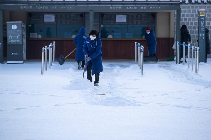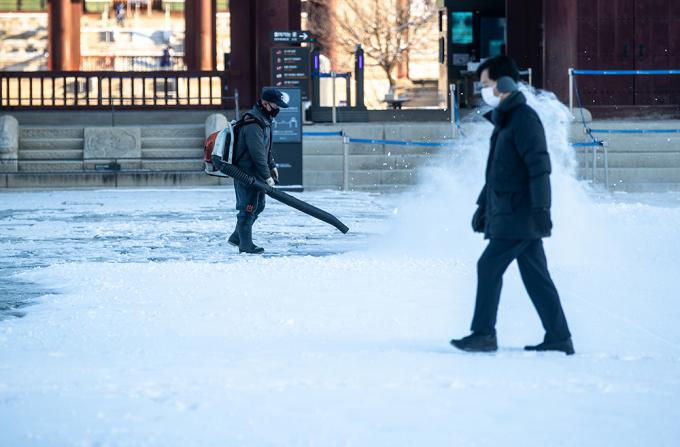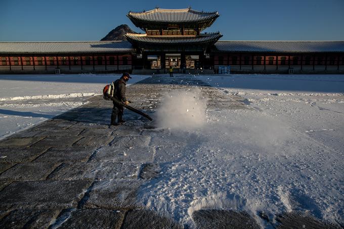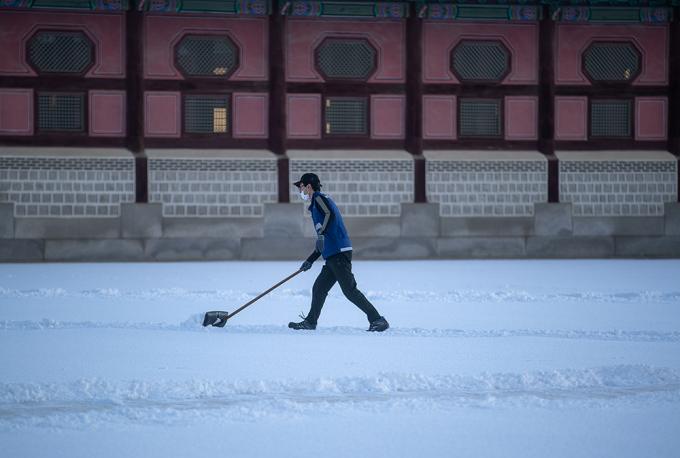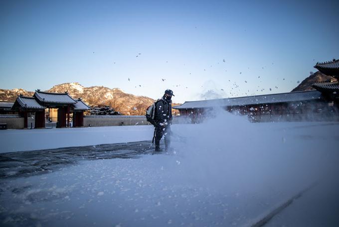 서울 등 수도권에 많은 눈이 내린 4일 오전 서울 종로구 경복궁에서 관계자들이 눈을 치우고 있다.