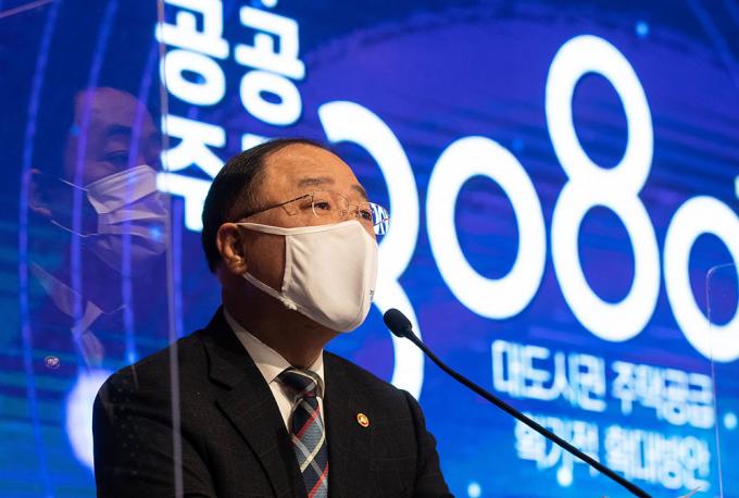 홍남기 경제부총리 겸 기획재정부 장관이 4일 오전 서울 종로구 정부서울청사 별관에서 공공주도3080+ 대도시권 주택공급 획기적 확대방안을 발표하고 있다.