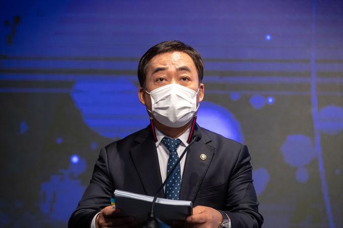 변창흠 국토교통부 장관이 4일 오전 서울 종로구 정부서울청사 별관에서 공공주도3080+ 대도시권 주택공급 획기적 확대방안을 발표를 마친 뒤 질문에 답하고 있다.