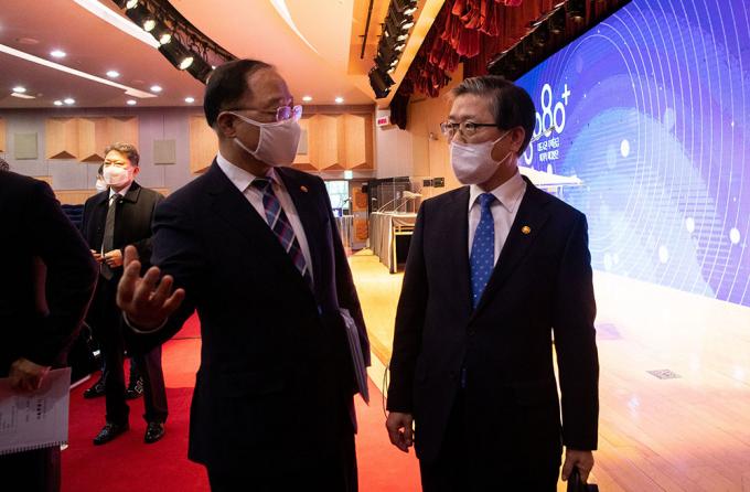홍남기 경제부총리 겸 기획재정부 장관과 변창흠 국토교통부 장관이 4일 오전 서울 종로구 정부서울청사 별관에서 공공주도3080+ 대도시권 주택공급 획기적 확대방안 발표 마친 뒤 나가고 있다.