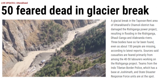 7일 인도 최대의 영자지인 '인디언 익스프레스(Indian Express)'와 그 자매지인 '파이낸셜 익스프레스', 영국 BBC 등에 따르면 이날 오전 우타라칸드주(州) 차몰리(Chamoli) 지구의 리시강가(Rishiganga)댐에 난다데비산에서 떨어진 빙하가 쏟아져 내렸다.