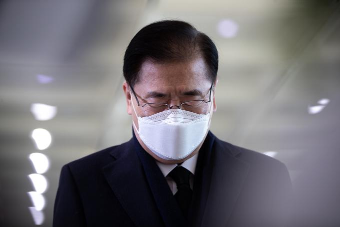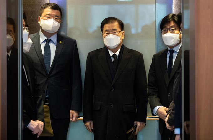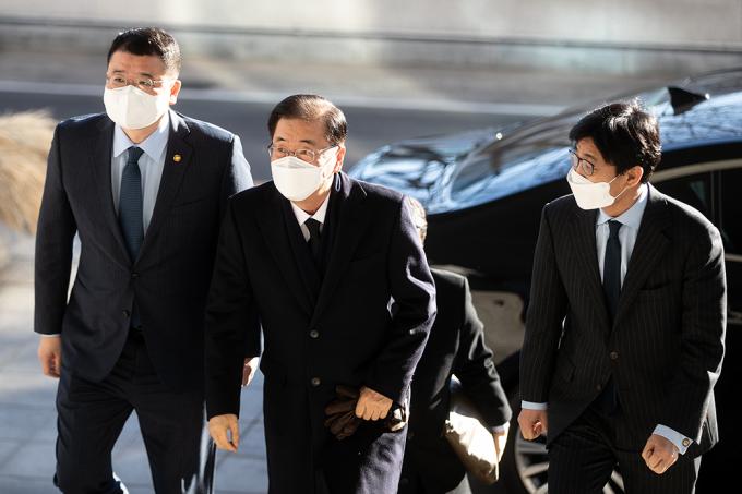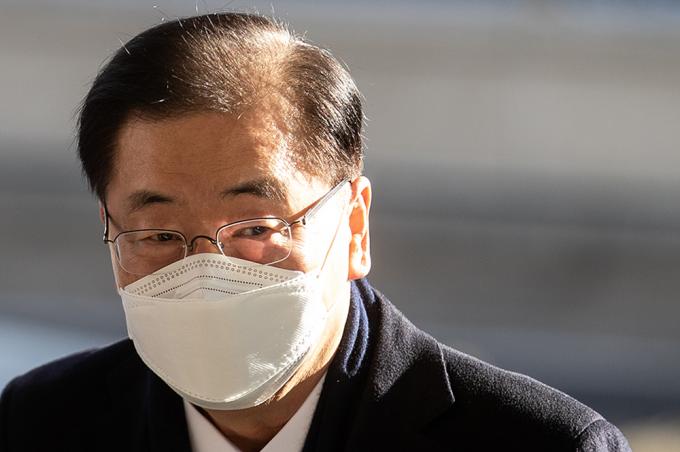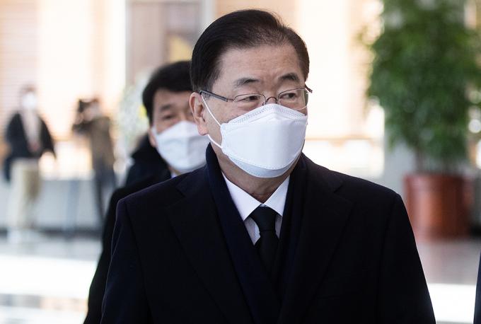 정의용 신임 외교부 장관이 9일 오전 서울 종로구 외교부청사로 첫 출근하고 있다.