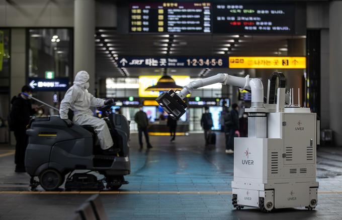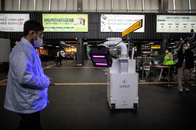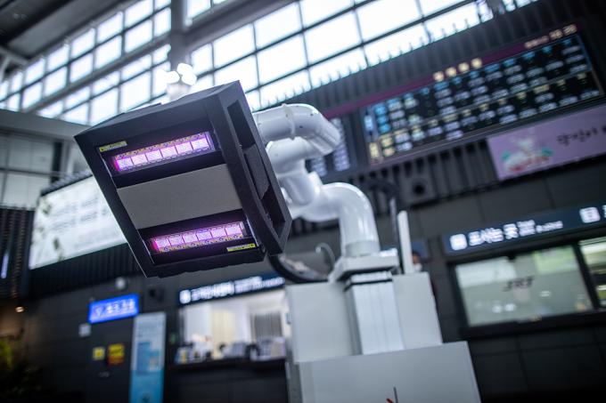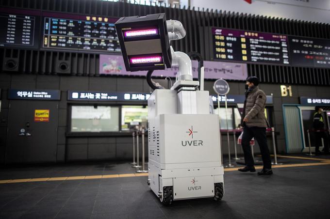 민족 대명절 설 연휴를 하루 앞둔 10일 오전 서울 강남구 수서역 대합실에서 자외선 방역로봇이 코로나19 확산 방지를 위한 방역작업을 하고 있다.