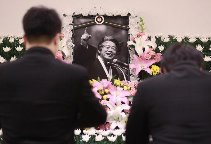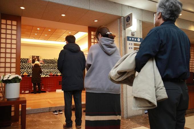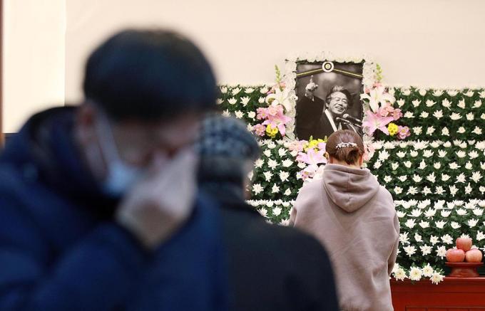 15일 종로구 서울대병원 장례식장에 마련된 故 백기완 통일문제연구소장 빈소를 찾은 시민들이 조문하고 있다.