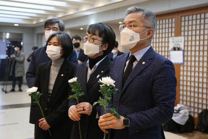 열린민주당 최강욱 대표(오른쪽부터), 김진애 의원, 강민정 의원, 김성회 대변인이 15일 오후 서울 종로구 서울대병원 장례식장에 마련된 고 백기완 통일문제연구소장 빈소를 찾아 조문하고 있다.