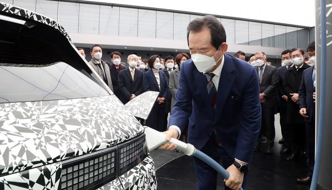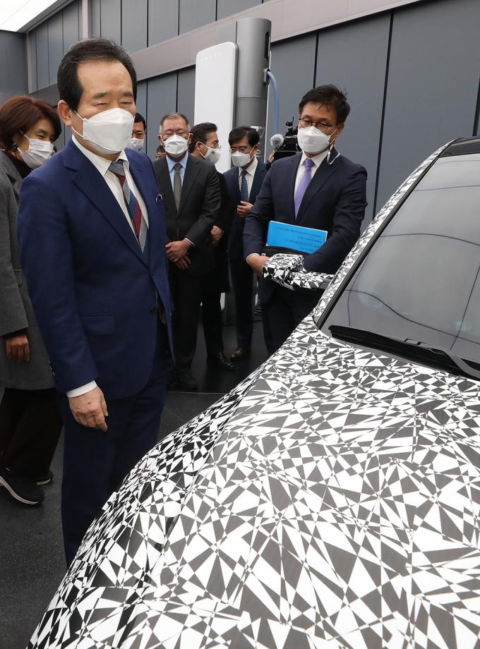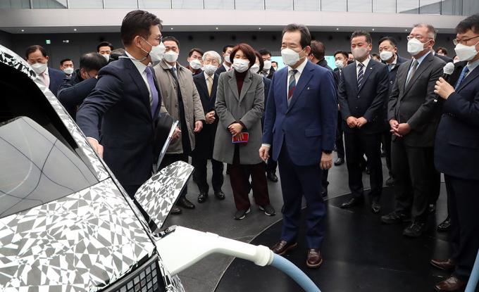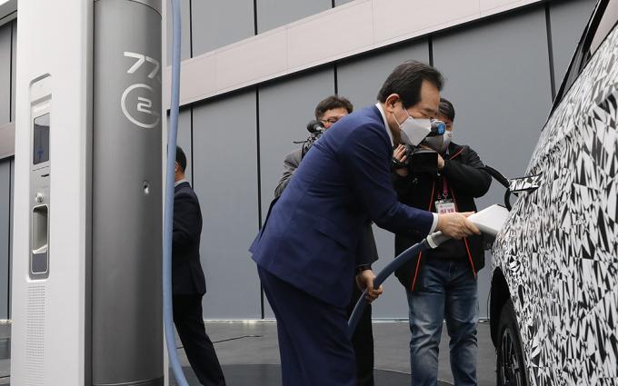 정세균 국무총리가 18일 오전 경기도 화성시 현대자동차 남양기술연구소를 찾아 전기차에 관한 설명을 듣고 충전 시연을 하고 있다.