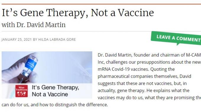 "접종 권유는 암예방 위해 항암치료 받으라는 격" 코로나19 백신으로 광범위하게 보급되고 있는 모더나와 화이자 백신은 본질적으로 백신이 아니며 이를 통해 코로나19를 예방하거나 전파를 막을 수 없다는 주장이 제기됐다.
