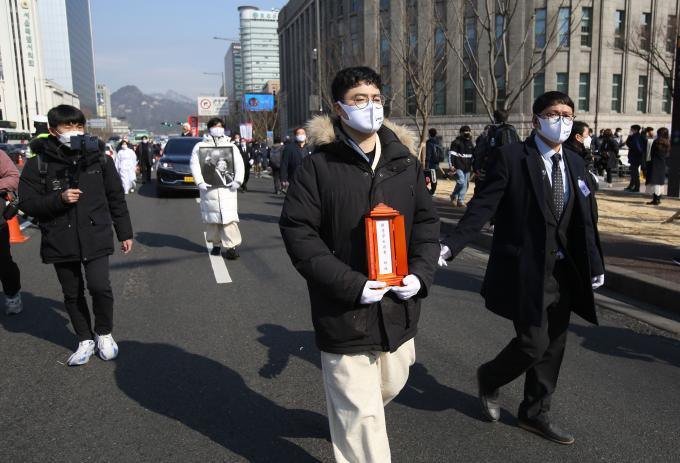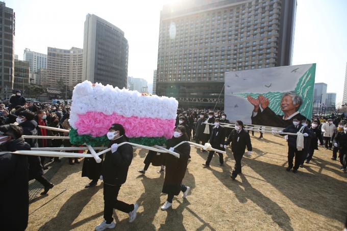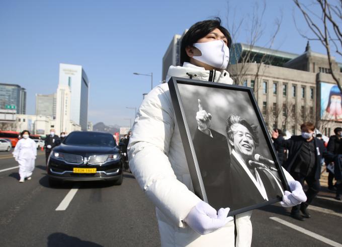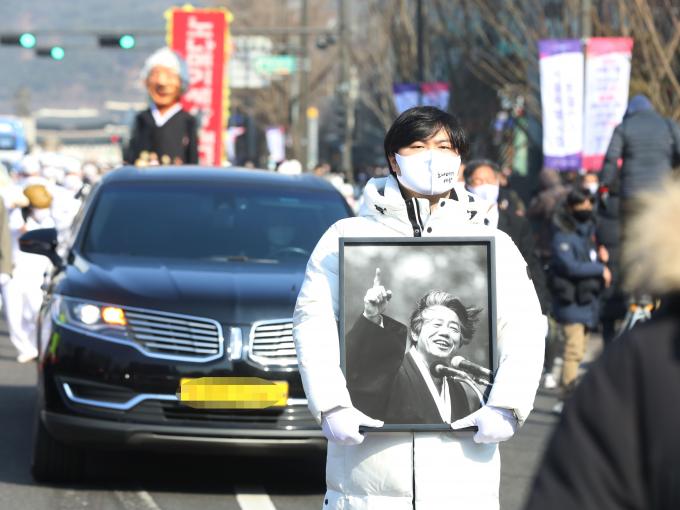 19일 서울 중구 세종대로에서 고 백기완 통일문제연구소장의 운구행렬이 영결식장인 서울광장으로 향하고 있다. [사진공동취재단]