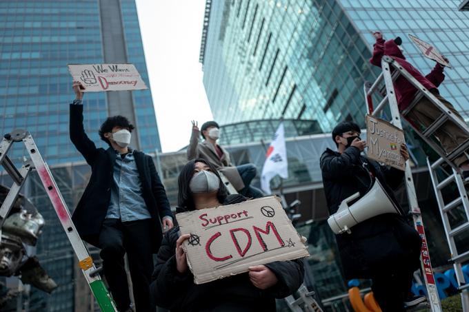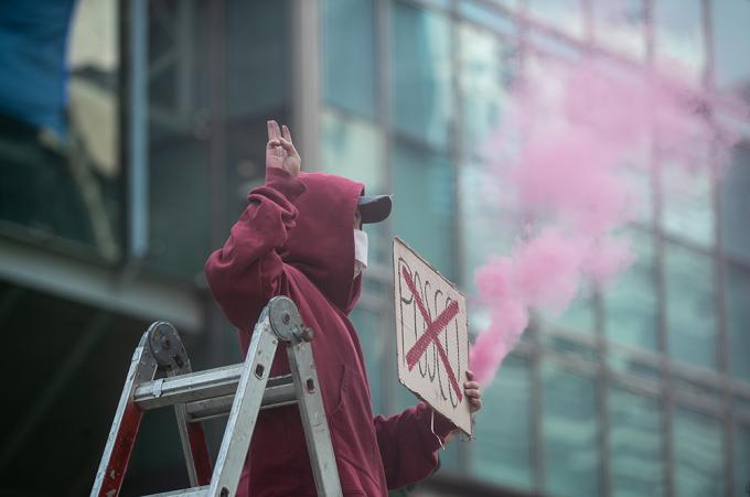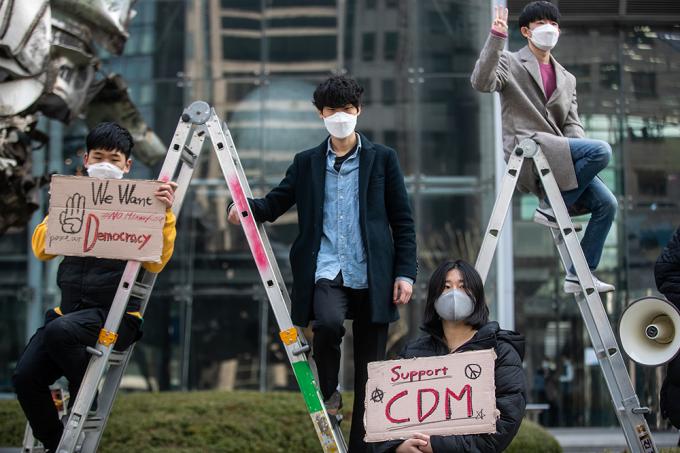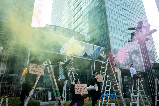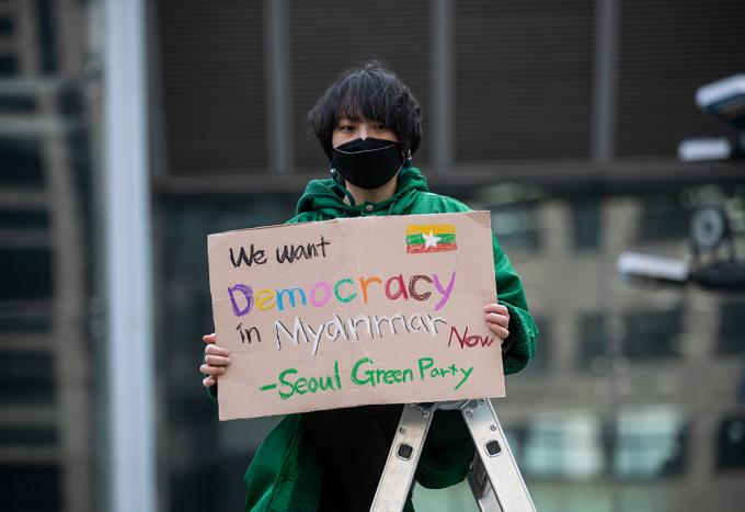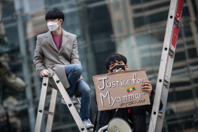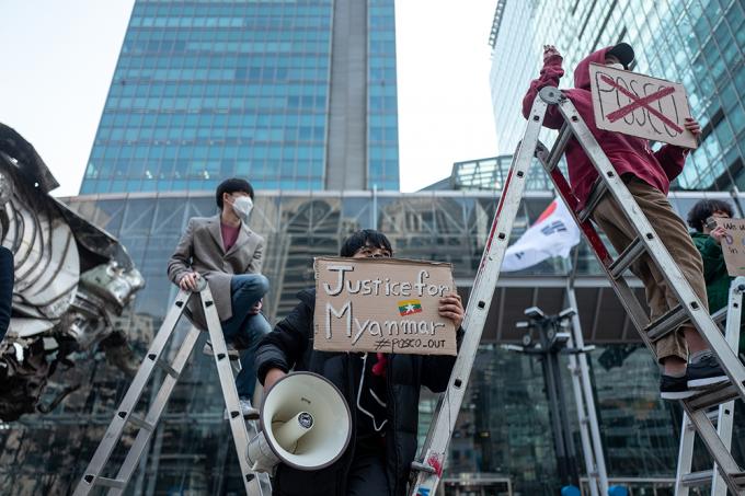 세계시민선언, 청년기후긴급행동 등 청년단체들이 22일 오후 서울 강남구 포스코센터 앞에서 미얀마 군부와 결탁한 포스코가 관계 청산할 것을 촉구하는 집회를 하고 있다. 이날 집회를 연 세계시민선언, 청년기후긴급행동, 서울녹색당은 "포스코는 미얀마 민주주의를 짓밟는 군부와 결탁하고 있다"고 주장하며 관계 청산을 촉구했다.