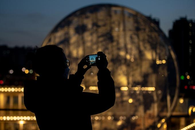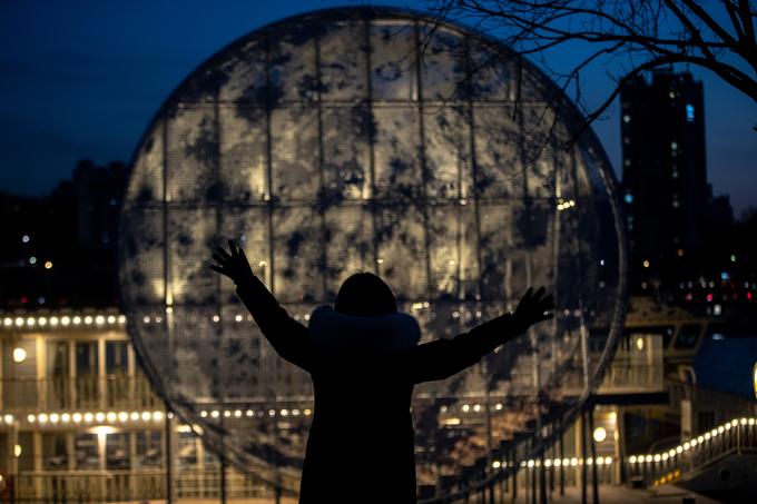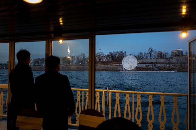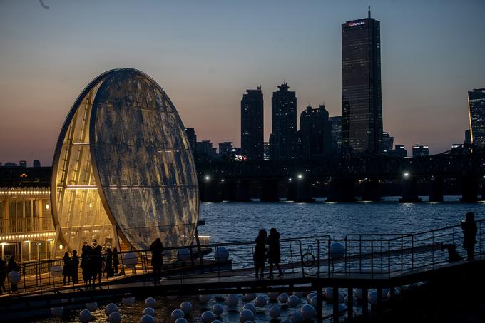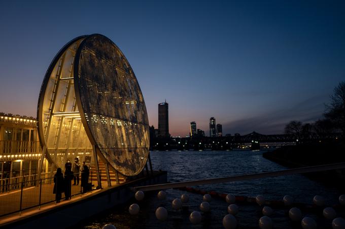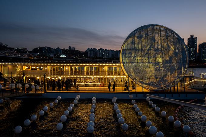 한강 노들섬에 방치돼 있던 선착장에 23일 인공달이 떴다. 지름 12m인 이 공공미술작품의 이름은 '달빛노들'.