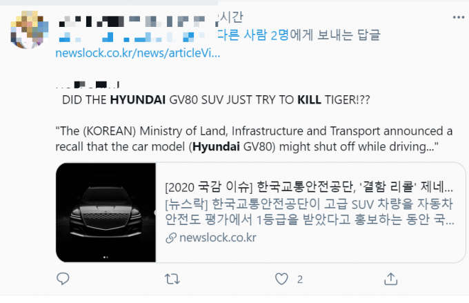 'u***'는 "이번 사고로 제네시스 브랜드를 처음 알게 됐다. 그 차의 안전장치(safety feature)로 타이거 우즈가 목숨을 건져 다행이다"고 말했다. 이어 복수의 트위터 사용자들도 제네시스 북미법인 계정을 태그하며 "우즈를 살려줘서 고맙다" "제네시스 최고" 등의 반응을 보였다.